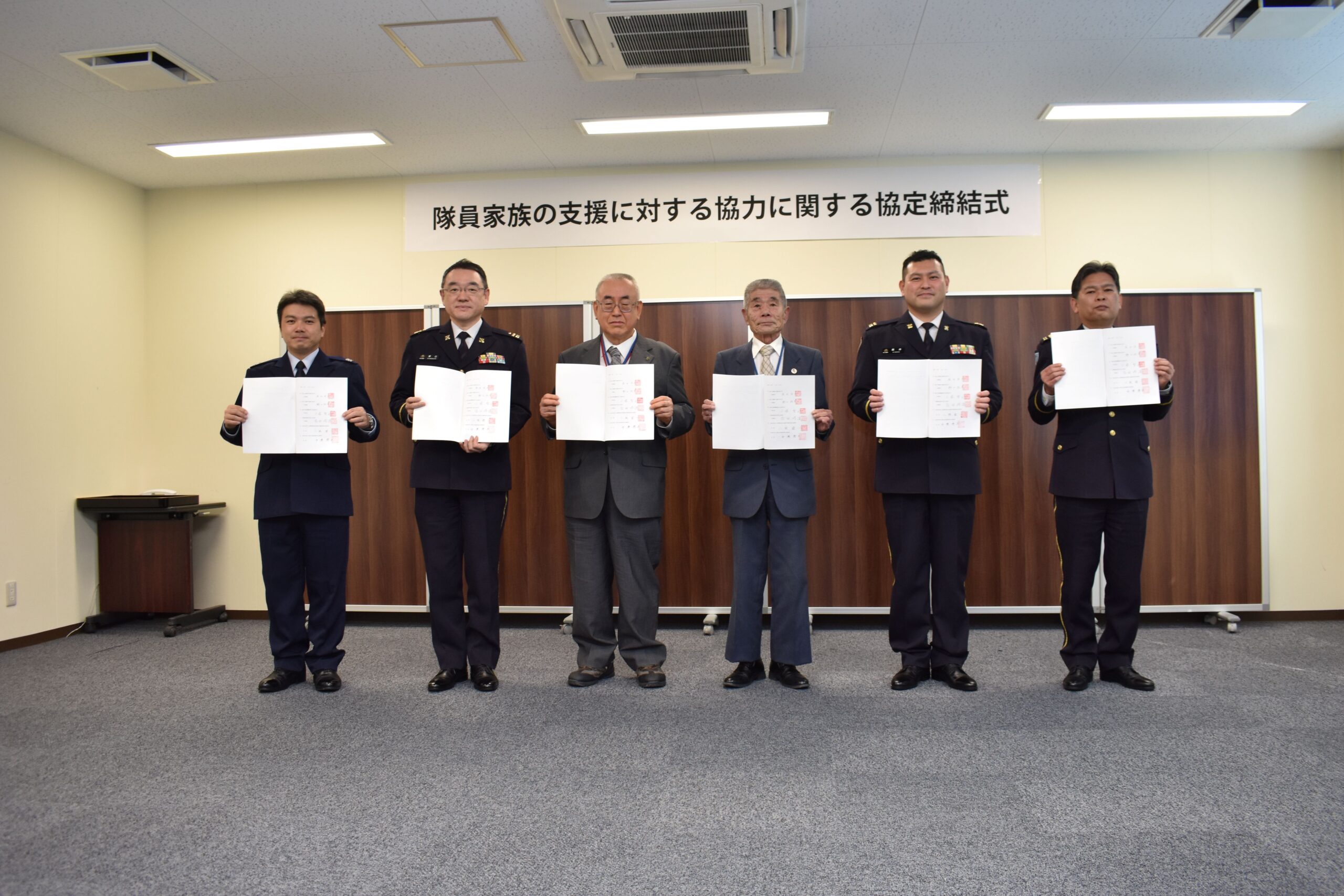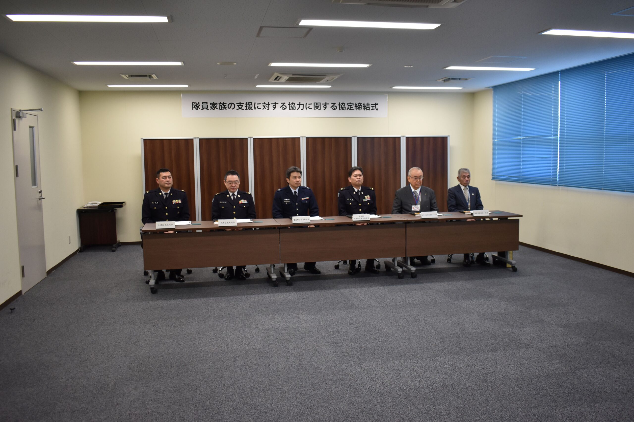これは、令和7年3月14日に「防衛省・家族会・隊友会」三者で取り交わされた、いわゆる「中央協定書」締結を受け、令和3年3月における前協定では完結し得なかった「滋賀地方協力本部、航空自衛隊饗庭野分屯基地及び公益社団法人自衛隊家族会」も加わった新たな協定を「大津・今津駐屯地・饗庭野分屯基地各司令、滋賀地方協力本部長、自衛隊家族会会長及び中澤隊友会長」が一堂に会し調印式が挙行されました。